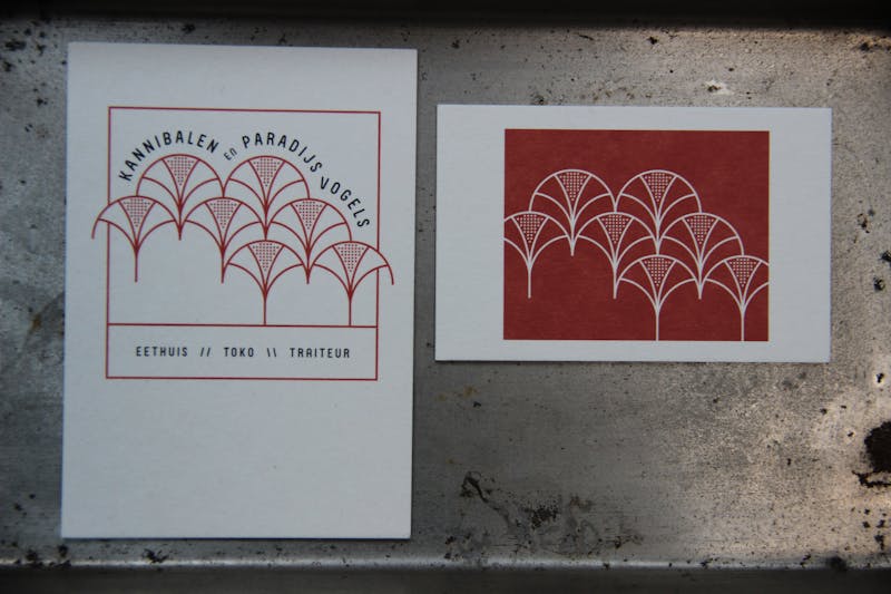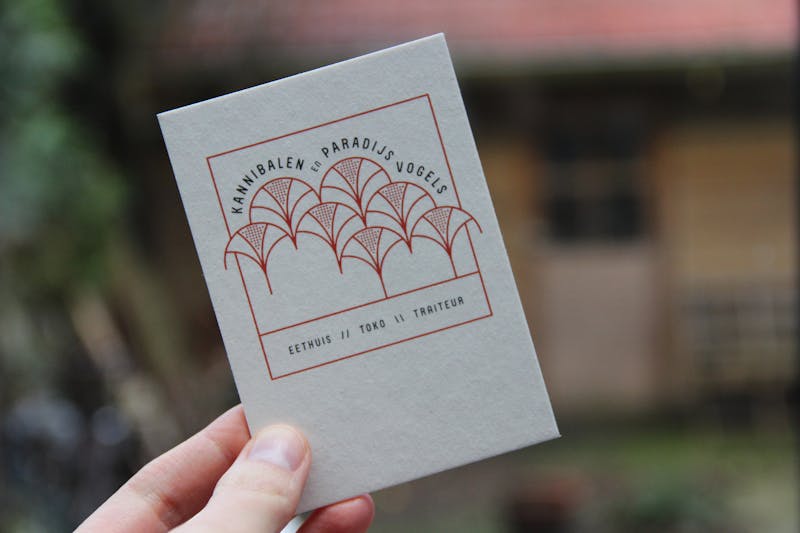 Kannibalen en Paradijsvogels is a toko with a Dutch Indonesian cuisine. The name of the dining room was chosen by the founders because of an old book that they had in their bookcase. It tells the story of a journey to New Guinea. The logo has become an ex libris ("from the library of") where the pattern is both pungent as joyous. Just like the name suggests.